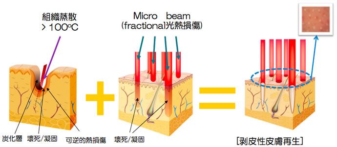 レーザーを点状照射し、皮膚の蒸散(蒸発させること)と凝固を起こし同時に治療。