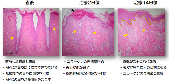 同時に蒸散した皮膚の内側に熱を伝えることにより、コラーゲンが生成。 皮膚の上皮化と共に皮膚再生が促されます。