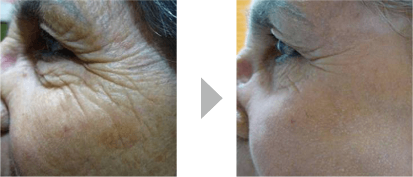 目元のシワがいかにもおばあちゃんという感じです。頬の方にまで達していますね。施術後はシワの長さが短くなり、かなり改善されています。