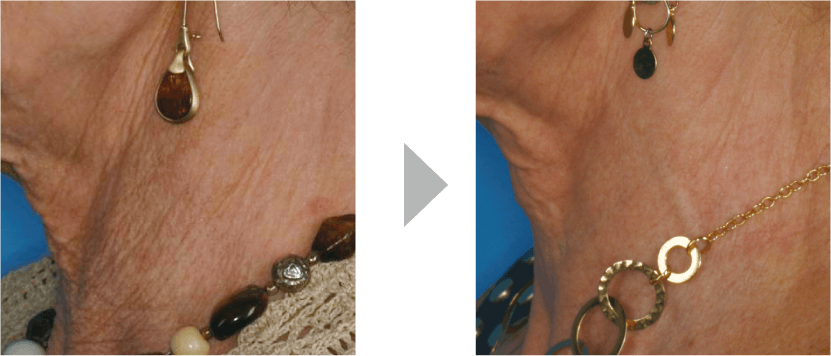 首元に加齢が出てしまっている状態です。細かいシワが多く、老けた印象。施術後は細かいシワがなくなり、かなり若々しくなっていますね。