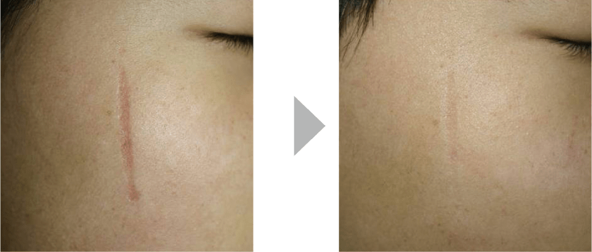 顔に怪我をしてしまってその後が傷跡が残ってしまうのは非常に悲しいことです。目立ってしまうし、ここまでの傷跡はメイクで隠すのも大変です。施術後はかなり改善されてうっすらと残っている程度。もう少し照射を続ければもっと薄くすることもできそうです。