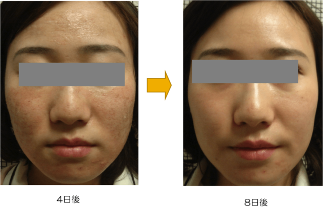 コラーゲンの再構築と生成がされ、皮膚上にできた傷跡(ニキビ跡、シワ、たるみを含みます)はこの再生性が繰り返すことによってなくなっていきます。