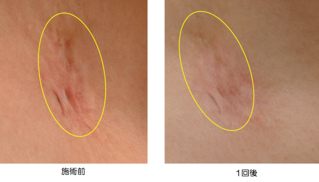 手術跡やリストカット跡など、傷を負ったあとにひきつれを起こしてしまうことがあります。こんな症状にもeco2フラクショナルレーザーは有効です。画像のように改善できます。