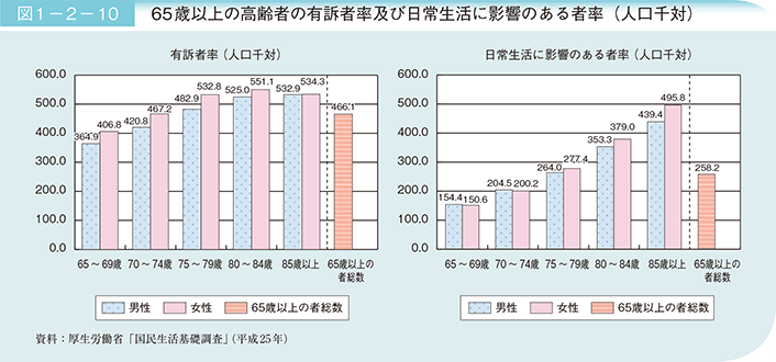 平成25(2013)年における65歳以上の高齢者の有訴者率(人口1,000人当たりの「ここ数日、病気やけが等で自覚症状のある者(入院者を除く)」の数)は466.1と半数近くの人が何らかの自覚症状を訴えている(図1-2-10)