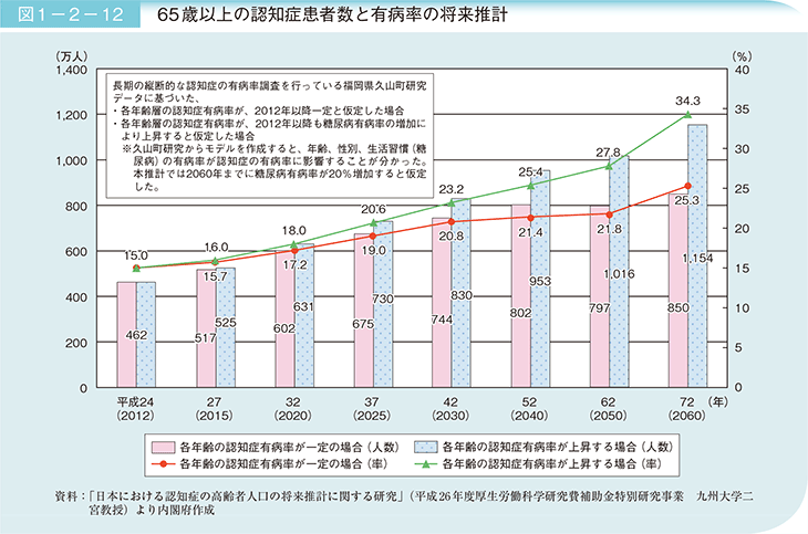 平成24(2012)年は認知症患者数が462万人(高齢者の7人に1人、有病率15.0%)