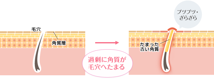 まず、特殊な処方をしたピーリング剤で皮膚表面の古い角質や、毛穴をふさいでいる角質を取り去ることでぶつぶつ、ざらざらを減らします。