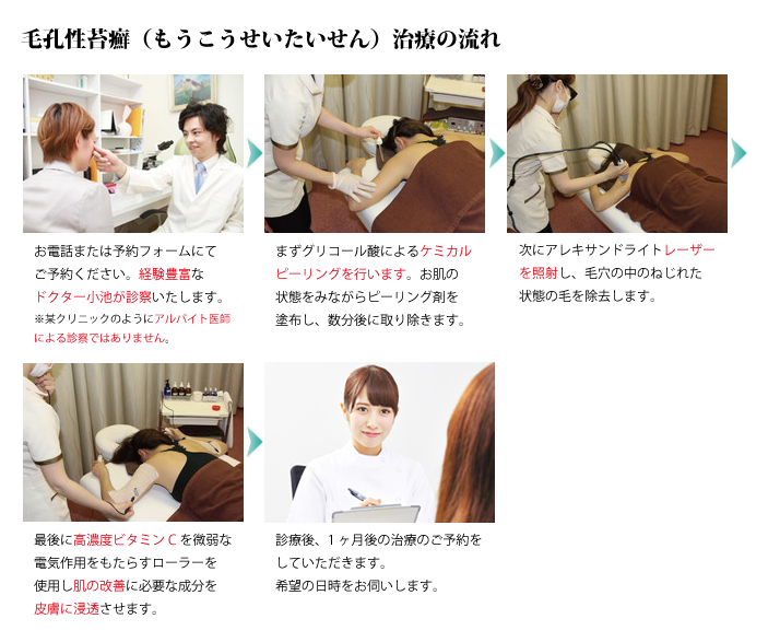 毛孔性苔癬の治療は時間がかかります。一回の治療は1時間くらいで、じっくり治療を行わないと改善は難しいですが、一回ごとに少しずつ改善してゆきます。