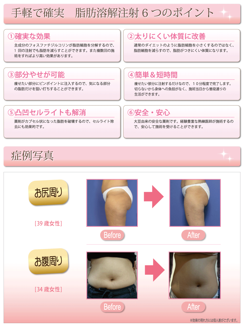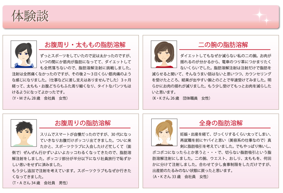 注入する部位の脂肪だけに作用するので、バストはそのままで背中や脇腹の脂肪だけを取るといった、ボディデザインも可能です。副作用が無く、注射で注入するだけで確実に脂肪を溶かし出すので、まとまったお休みが取れない方にもお薦めできる施術です。