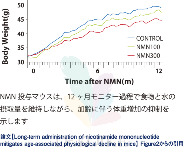 NMN処理マウスは、骨格筋のミトコンドリア酸化性リン酸化を増加させ、全身のエネルギー消費を増加させることで体重減少に寄与している可能性が高いと報告があります。