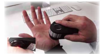 OligoScan本体で、手のひらの4か所に光をあてる だけで、わずか3分ほどで体内の必須・参考ミネラ ル20元素と、有害金属14元素が測定できます。髪の毛や爪を切ったり、血液を抜いたりする必要 はありません。