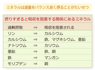 また、リンを摂りすぎるとカルシウムの吸収を阻害し、カルシウムを摂りすぎると鉄やマグネシウムの吸収を阻害します。このように、それぞれのミネラルはバランスが大切です。