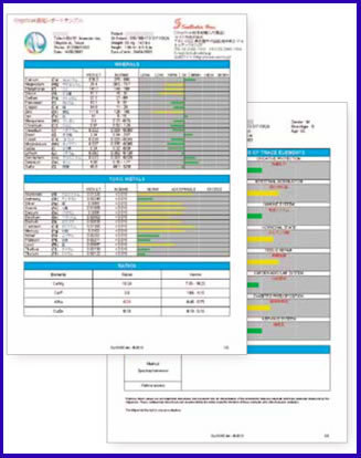 1枚目のレポートには、必須+参考ミネラル20元素の結 果と、有害金属14元素の蓄積状況が表示されます。2枚目には、これら34元素のミネラルによって、今後起 こり得る身体の状態の様々なリスクが表示されます。