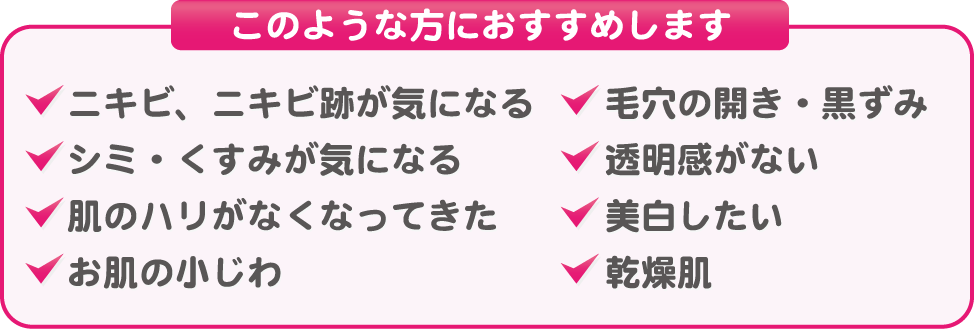 毛穴に浸透して詰まった汚れや皮脂酸化物を溶かし出し、毛穴を引き締めます。 - くすみを除去して美白