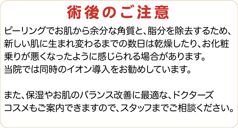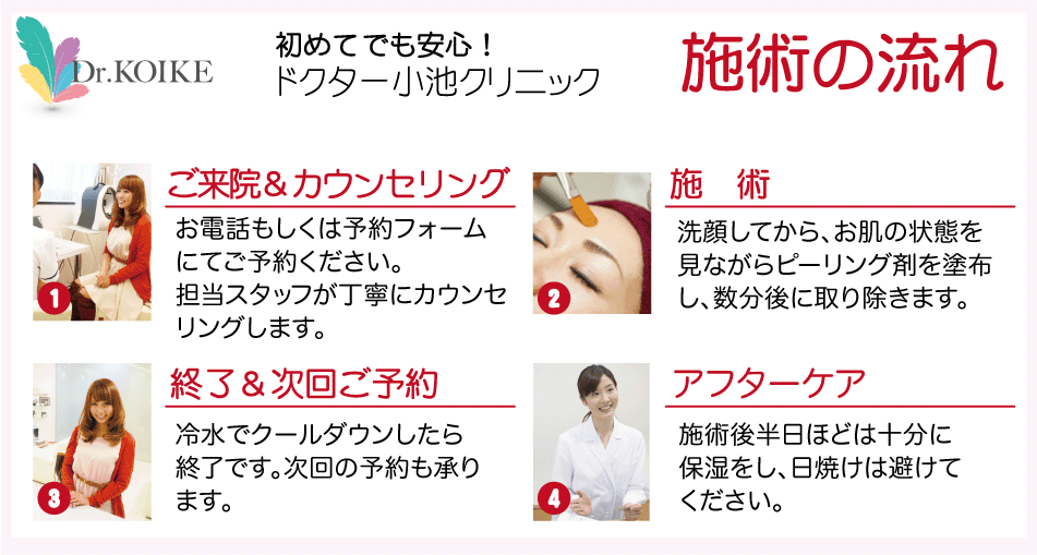 ドクター小池クリニックでは、肌の状態に合わせてピーリング剤の種類や濃度、塗布時間を調節します。最初の3~6回は1〜2週間に1回来院していただき、徐々にピーリングを強くしてゆきます。これにより副作用が少なく効果的に効果的な治療を行うことができます。